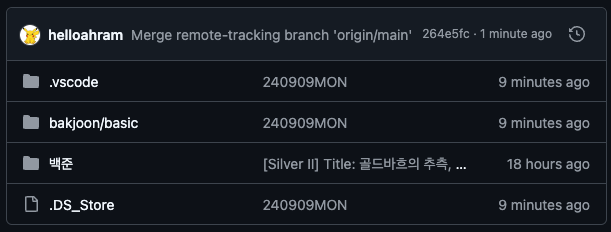 그래서 Pull 해보니, 원격 저장소에 백준허브가 자동으로 올린 파일들이 있었다