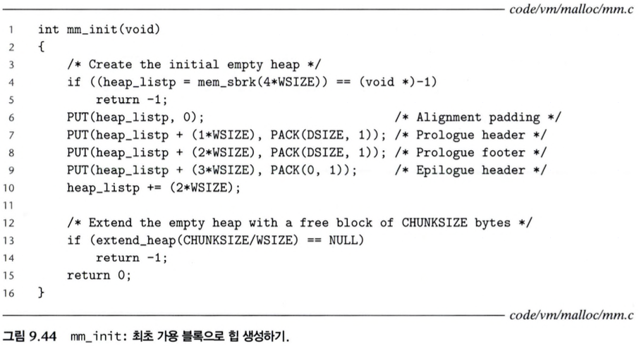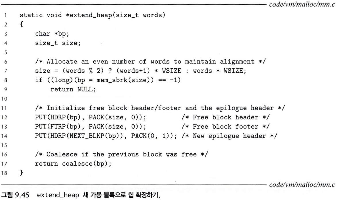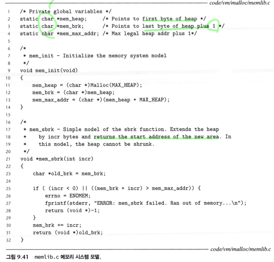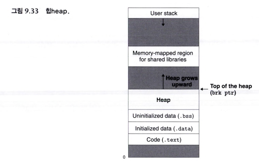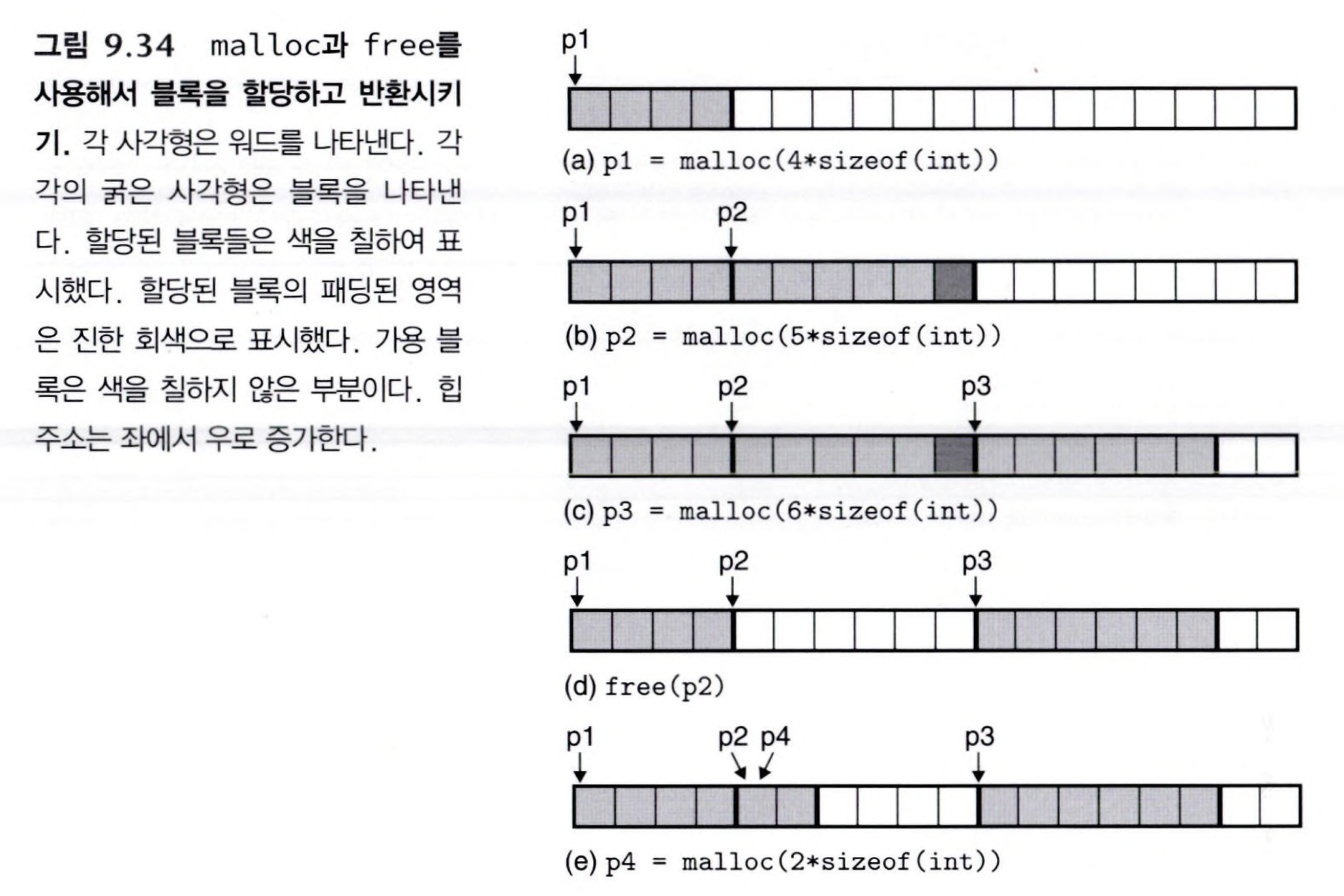 malloc 같은 동적 메모리 할당기는 mmap 과 munmap 함수를 사용해서 명시적으로 힙 메모리를 할당하거나 반환하며, 또는 sbrk 함수를 사용할 수 있다