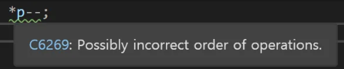 언뜻 보면 포인터 p를 역참조해서 그 값을 -1하는 코드로 보일 수 있지만 위 코드는 연산자 우선순위로 인해서 전혀 다른 동작을 보여준다