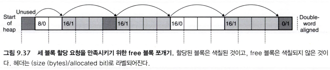 어플리케이션이 k 바이트의 블록을 요청할 때, 할당기는 요청한 블록을 저장하기에 충분히 큰 가용 블록을 리스트에서 검색한다
