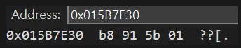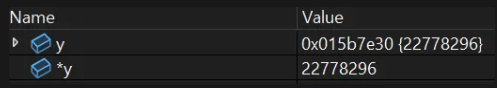 실제로 y가 가리키고 있는 주소를 확인해 보면 아래와 같은 값이 들어있는 것을 볼 수 있는데 위 값은 y를 역참조 연산으로 가져온 10진수 22778296를 16진수로 변환한 뒤, 뒤에서부터 2자리씩 읽은 값임을 계산을 통해 확인할 수 있다.