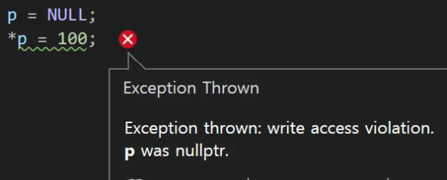 포인터가 NULL을 가리키고 있을 때도 동일한 오류가 나타나는것을 볼 수 있다