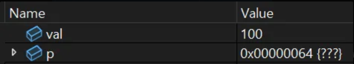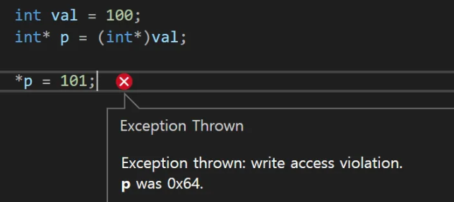 이때 p의 값을 보면 16진수로 64. 즉, val의 값을 주소로서 가지고 있는것을 확인할 수 있다, 당연히 포인터에는 어떤 주소던지 넣을 수 있지만 해당 포인터를 역참조하여 그 주소의 값을 가져 올때는 유효하지 않은 주소 영역에 접근하려고 하여 오류가 발생할 수 있다