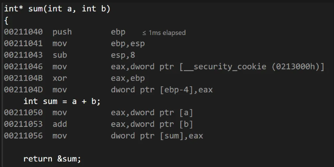 이는 sum 함수가 return을 하면서 스택을 정리하는 동작에 사용했던 스택메모리를 따로 다른 값으로 초기화하는 등의 동작이 없기 때문인데, 이 때문에 다른 함수가 호출되어 해당 메모리를 덮어 쓸 때까지는 정상값이 유지되는 것처럼 보일 것이다