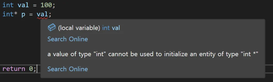 int*형 변수에 int형의 변수를 대입하려고 하면 대부분의 컴파일러에서는 위와 같이 이를 제지할 것이다