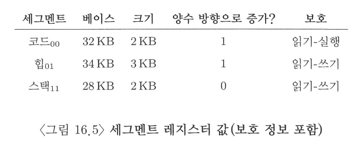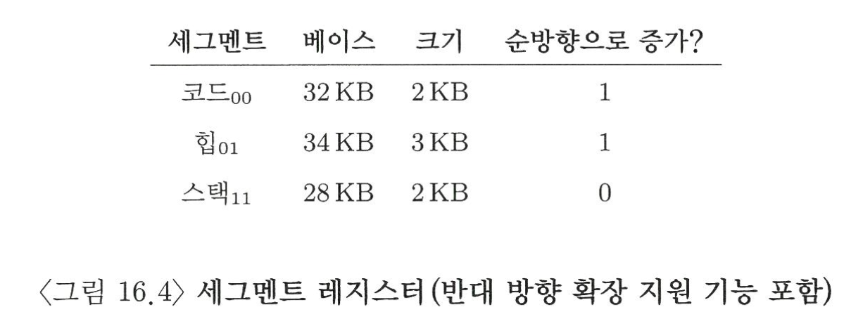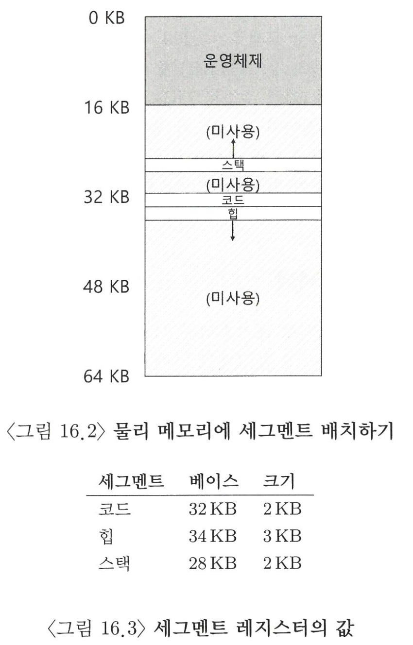 그림 16.2에서 64KB의 물리 메모리에 3개의 세그먼트와 운영체제로 예약된 16KB 영역의 경우, 사용 중인 메모리에만 물리 공간이 할당되어 사용되지 않은 영역이 많은 대형 주소 공간*을 수용할 수 있다