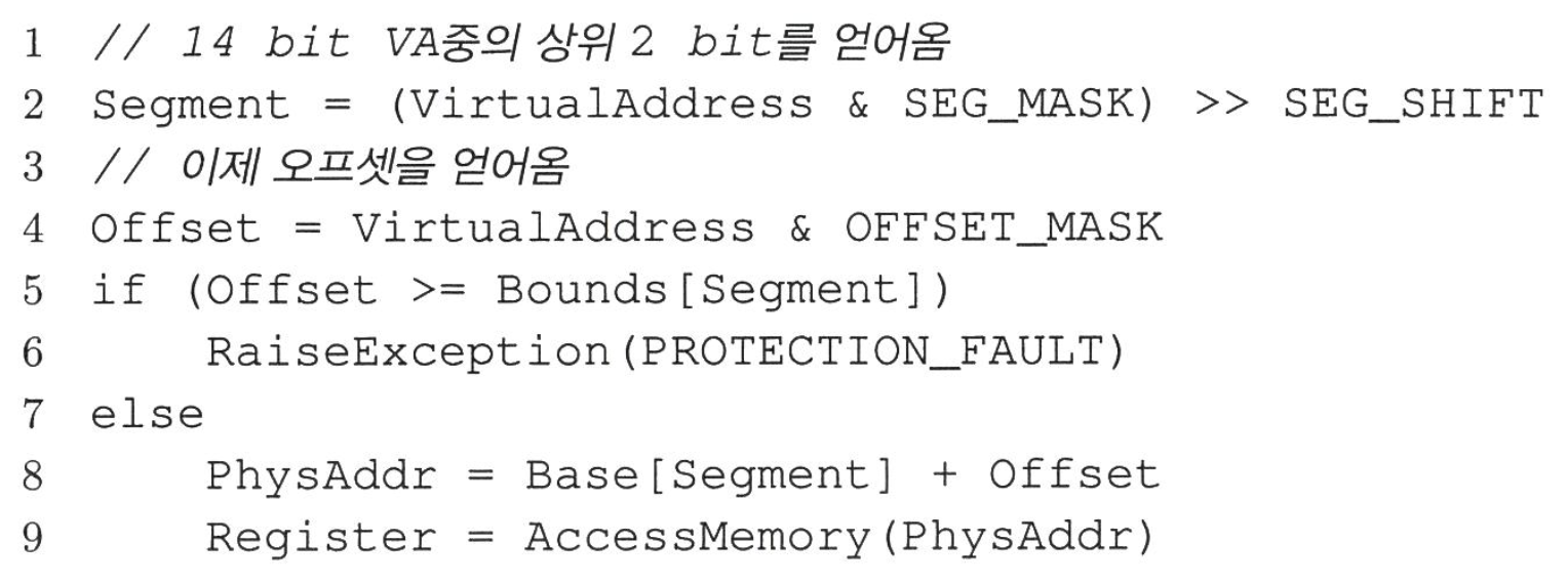 최상위 비트가 00일 때, 가상 주소가 코드 세그먼트를 가리킨다는 것을 하드웨어가 알고, 코드 세그먼트의 베이스와 바운드 쌍을 사용하여 정확한 물리 메모리에 재배치한다