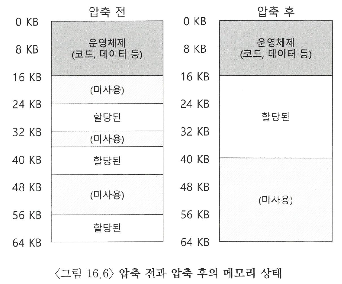 이 문제의 해결책 중 한 가지는 기존의 세그먼트를 정리하여 물리 메모리를 압축 Compact 하는 것이다