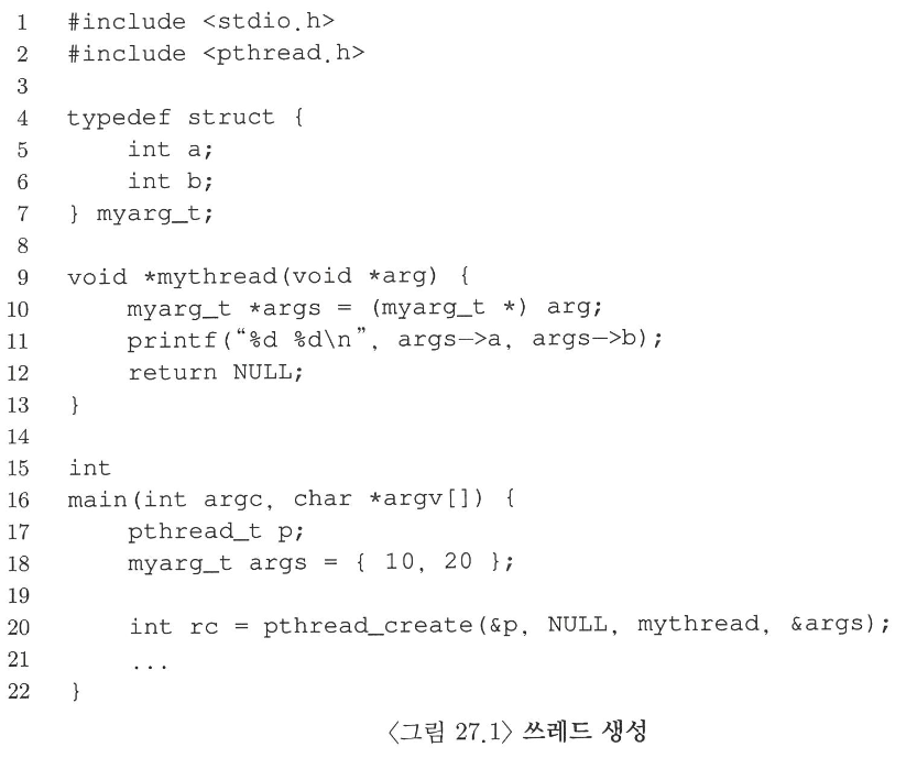 이 장에서 사용한 예제 코드를 컴파일하기 위해서는 pthread.h 헤더를 포함시켜야 한다