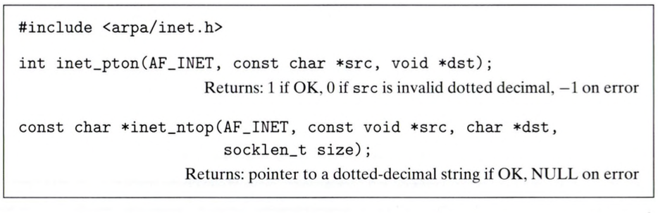 응용프로그램들은 IP 주소와 dotted-decimal 스트링 사이를 inet-pton과 inet_ntop을 사용하여 상호 변환한다