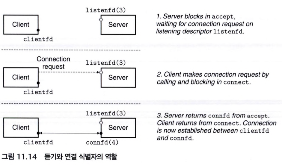 accept 함수는 클라이언트로부터의 연결 요청이 듣기 식별자 listenfd 에 도달하기를 기다리고