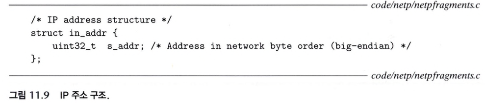 IP 주소 구조체의 주소는 호스트 바이트 순서가 리틀 엔디안인 경우에도 항상 네트워크 바이트 순서 (빅 엔디안) 로 저장된다