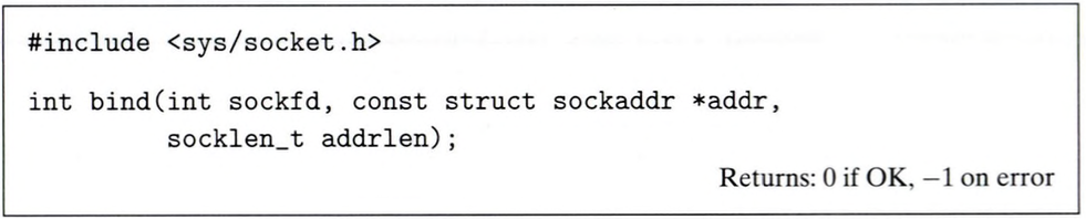 bind 함수는 소켓 식별자 sockfd 에 대해 주소 구조체 addr 를 바인딩하여