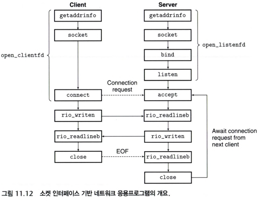 소켓 인터페이스는 네트워크 응용을 만들기 위한 Unix I/O 함수들과 함께 사용되는 함수의 집합이다