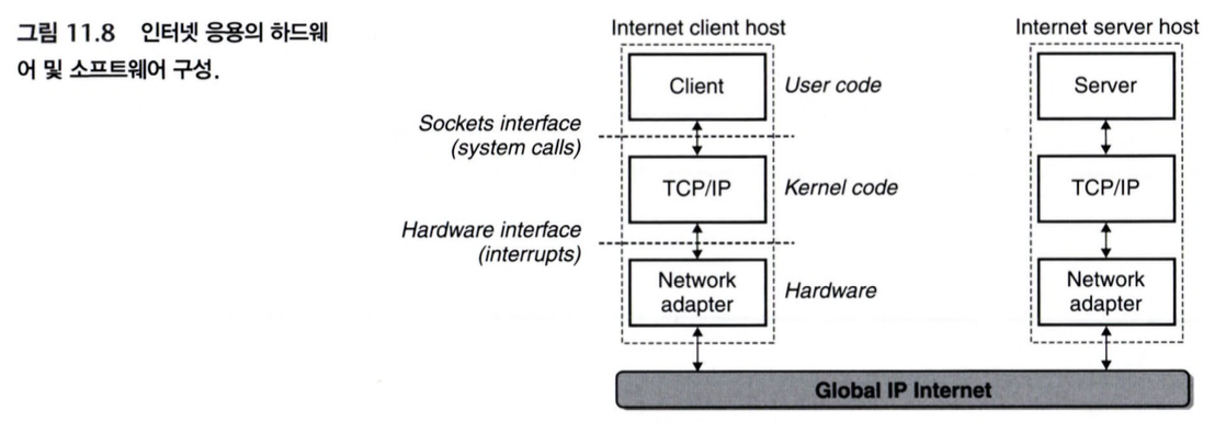 각 인터넷 호스트는 TCP/IP Transmission Control Protocol/ Internet Protocol 을 구현한 소프트웨어를 실행하며 이것은 거의 모든 현대 컴퓨터 시스템에서 지원되고 있다, 인터넷 클라이언트와 서버는 소켓 인터페이스와 Unix I/O 함수들의 혼합을 사용해서 통신한다