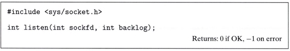listen 함수는 sockfd 를 능동 소켓에서 듣기 소켓으로 변환하며, 듣기 소켓은 클라이언트로부터의 연결 요청을 승락할 수 있다