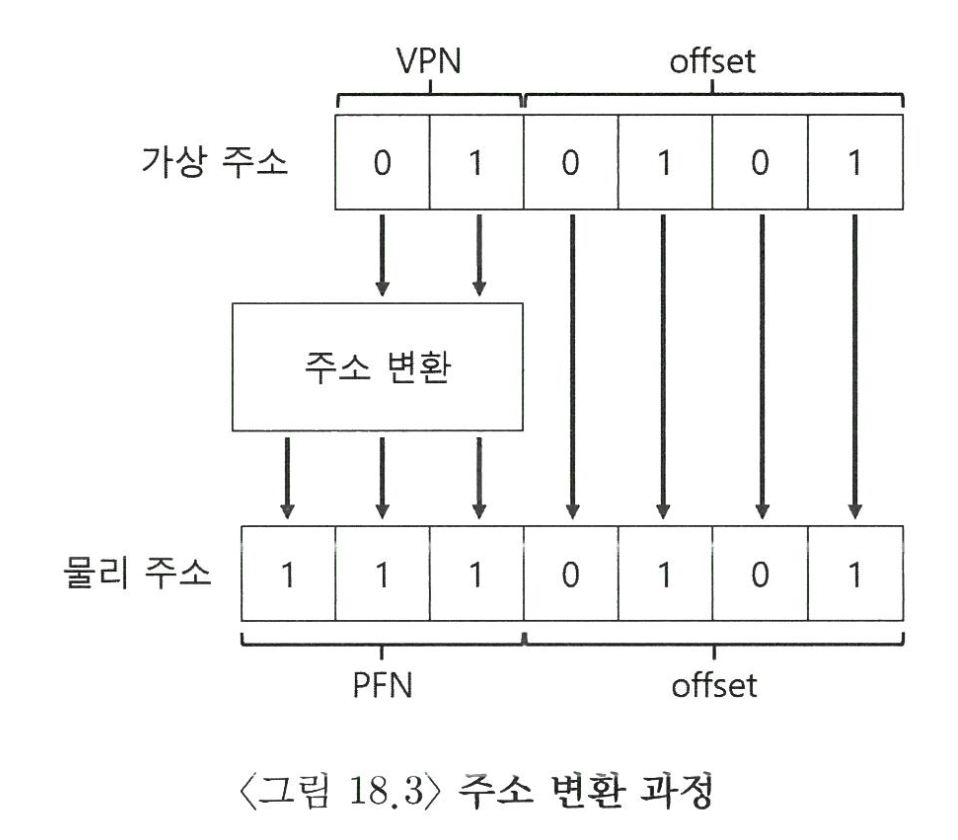 가상 페이지 번호 Virtual Page Number, VPN 와 페이지 내의 오프셋, 2개의 구성 요소로 분할한다
