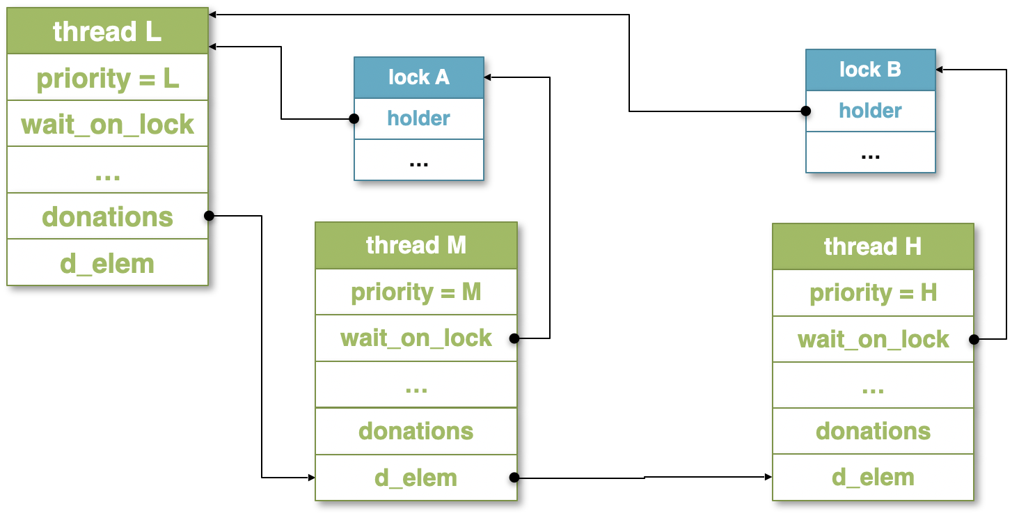 이런 문제를 해결하기 위해 Priority Donation 을 구현해야 한다, 아까와 같은 상황에서 H 가 자신이 가진 Priority 를