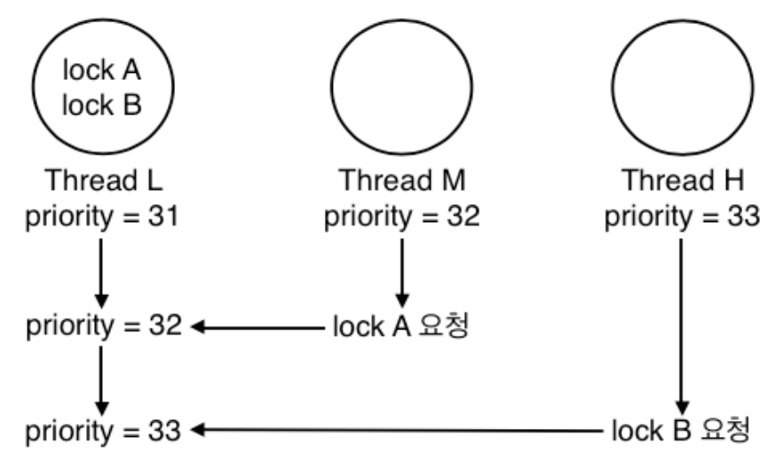 M 이 Lock A 를, H 가 Lock B 를 각각 요청한다면 L 은 (자신이 가지고 있는) Lock 을 요청한 모든 Thread 들에게 Priority 를 양도 받고, 이 중 가장 높은 Priority 를, 일시적으로 자신의 Priority 를 가진다