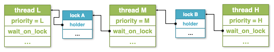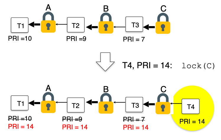 아래 그림처럼 Chained Lock Holding Relationship 인 경우 제일 높은 Prioirty 가 재귀적으로 Donate 된다
