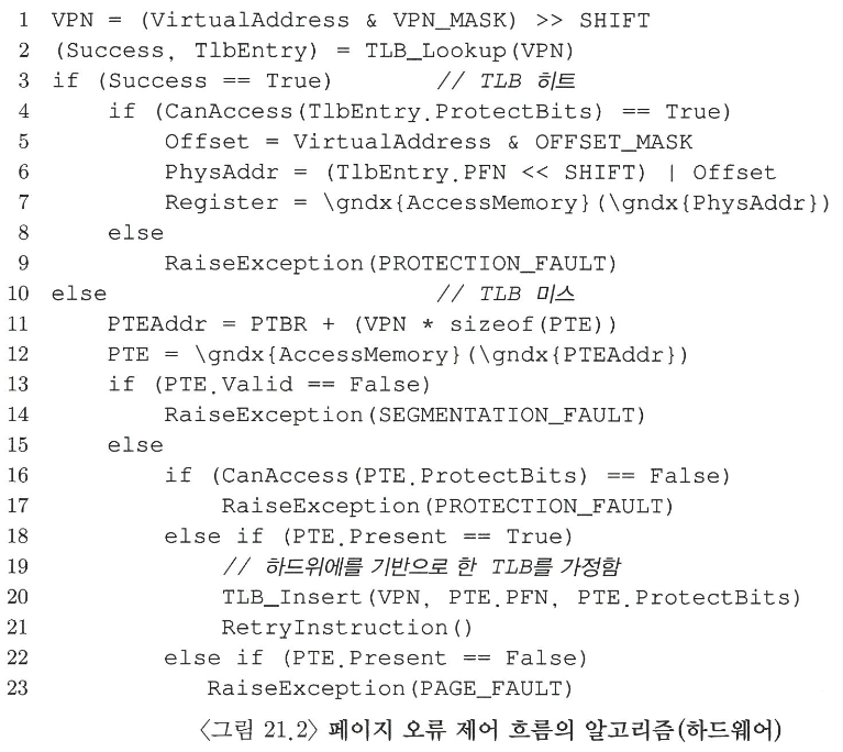 하드웨어는 가상 주소에서 VPN 을 추출한 후에 TLB 에 해당 정보가 있는지 검사하고 (TLB 히트) 만약 히트가 되면 물리 주소를 얻은 후에 메모리로 가져온다 (추가적인 메모리 접근이 필요 없다)