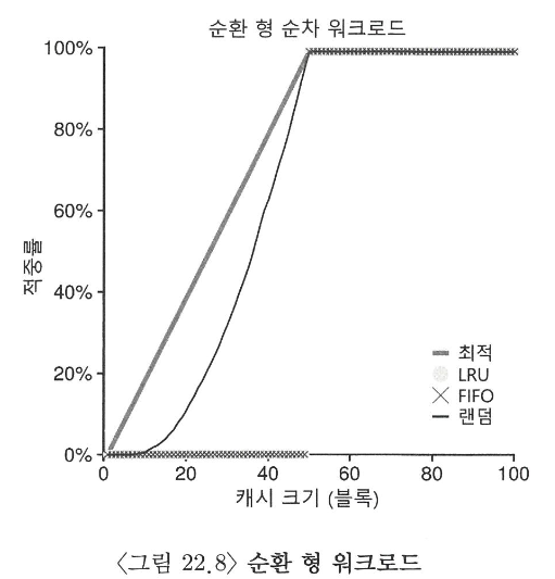 순체적으로 페이지가 계속 순환되기때문에 FIFO와 LRU가 반복적으로 오래된 페이지를 교체하다가 다시 필요하게 되서 히트율이 낮아질 수 있음. → 0%