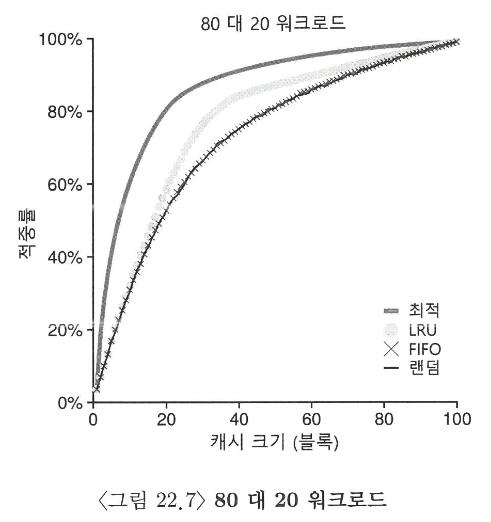 랜덤과 FIFO 정책이 상당히 좋은 성능을 보이지만, LRU 가 더 좋은 성능을 보인다 (하지만 LRU 의 과거 정보도 완벽하지는 않다)