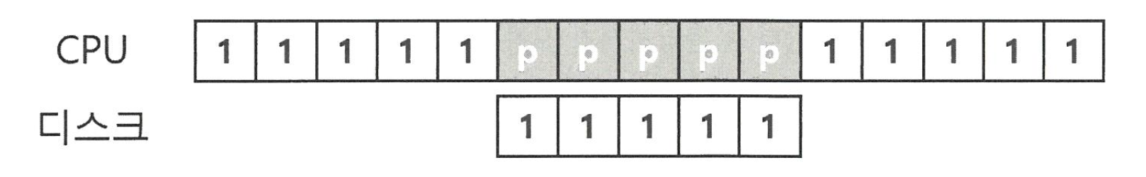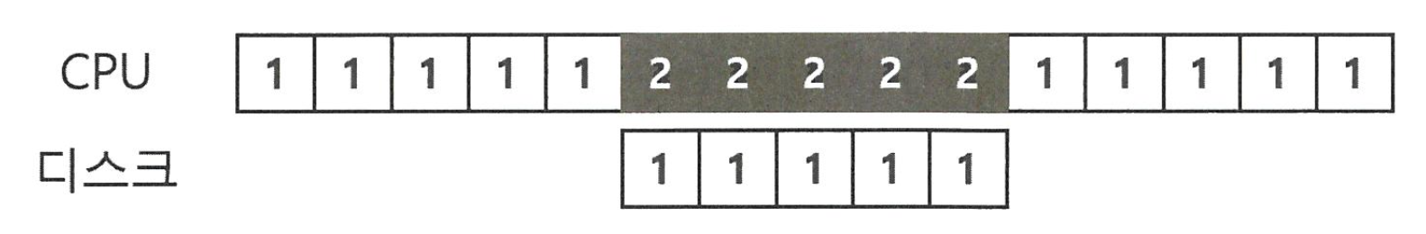 오른쪽 그림은 프로세스 1 의 요청이 디스크에서 처리되는 동안 프로세스 2 를 CPU 에서 실행시키는 상황이다