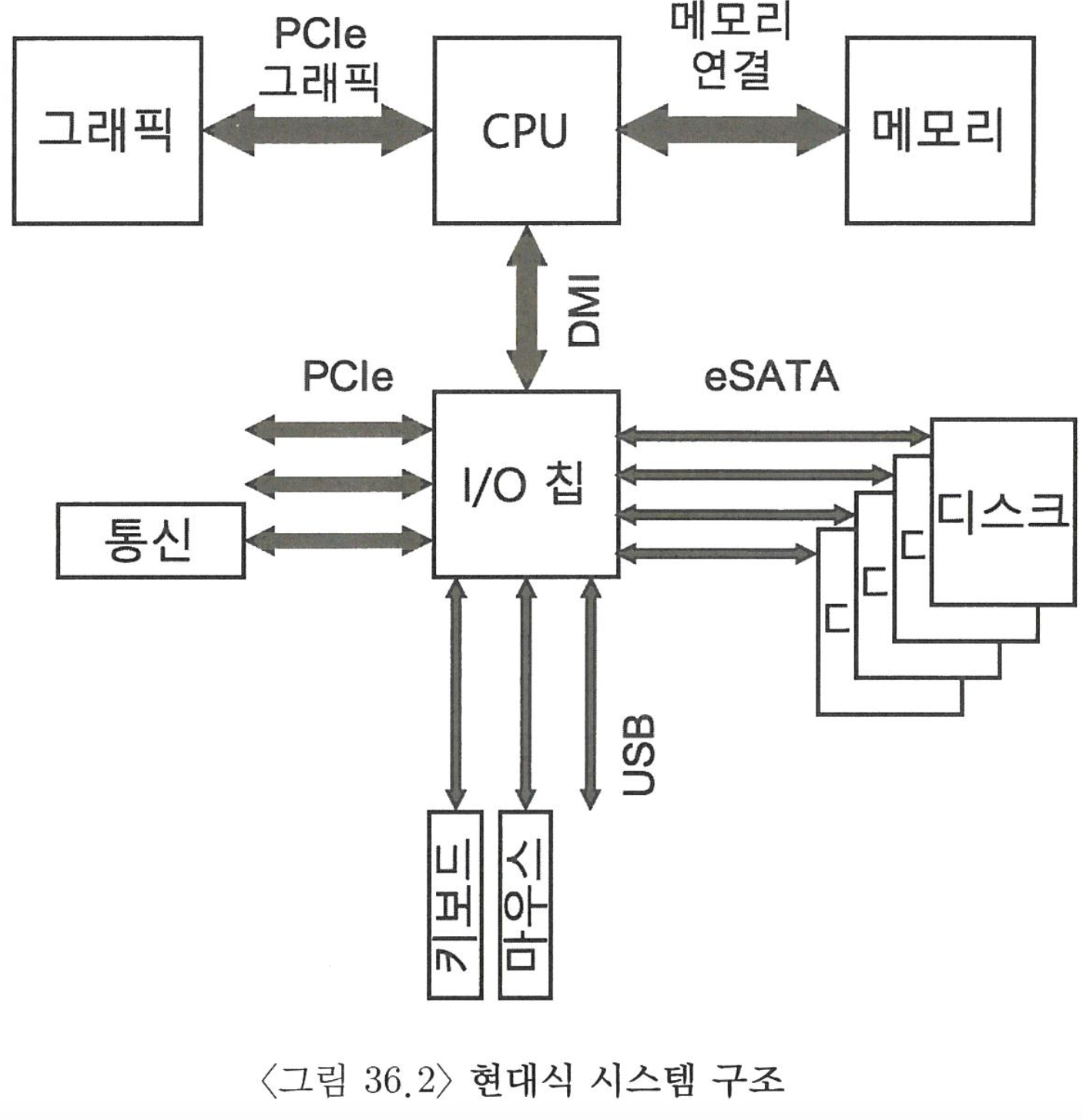 아래에는 SCSI 나 SATA 또는 USB 와 같은 주변장치용 버스가 있고, 디스크, 마우스, 키보드와 같은 느린 장치들이 연결된다