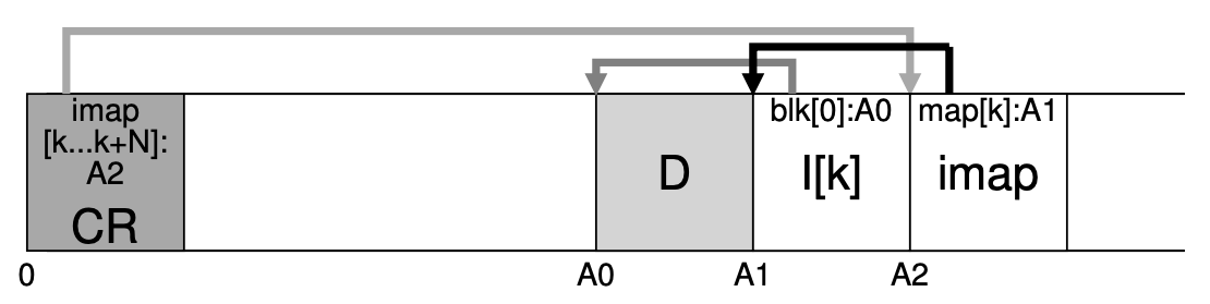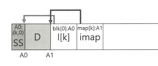 blk[0]:A0 은 첫번째 블럭의 주소가 A0, I[K] 는 K번째 아이노드, map[K]:A1 는 K번째 아이노드가 A1 에 위치해 있다는 뜻이다