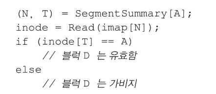 LFS 는 각 데이터 블럭 D 에 대해 D 가 속한 파일의 아이노드 번호 (어떤 파일에 속하는지) 와 파일 내에서 오프셋 (해당 파일에 몇 번째 블럭인지) 를 저장하고, 이 정보를 세그먼트 첫 머리에 있는 세그먼트 요약 블럭 SEgment Summary Block 자료 구조에 저장한다