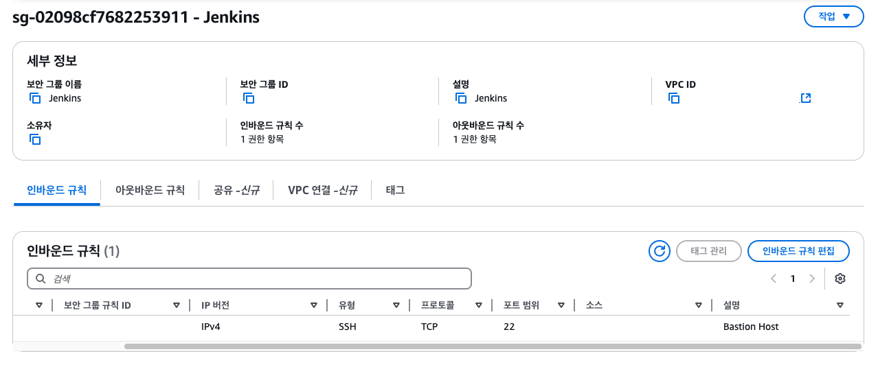 Bastion Host 에 탄력적 IP 를 할당하고, Jenkins Instance 의 보안 그룹에 Bastion Host 22 Port 만 접근할 수 있게 설정하면 된다