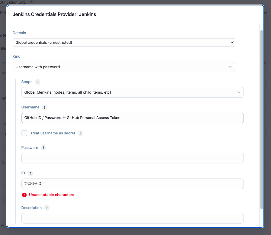 Username 은 Github ID, Password 는 Github 의 Personal Access Token 을 발급 받아 넣어 준다