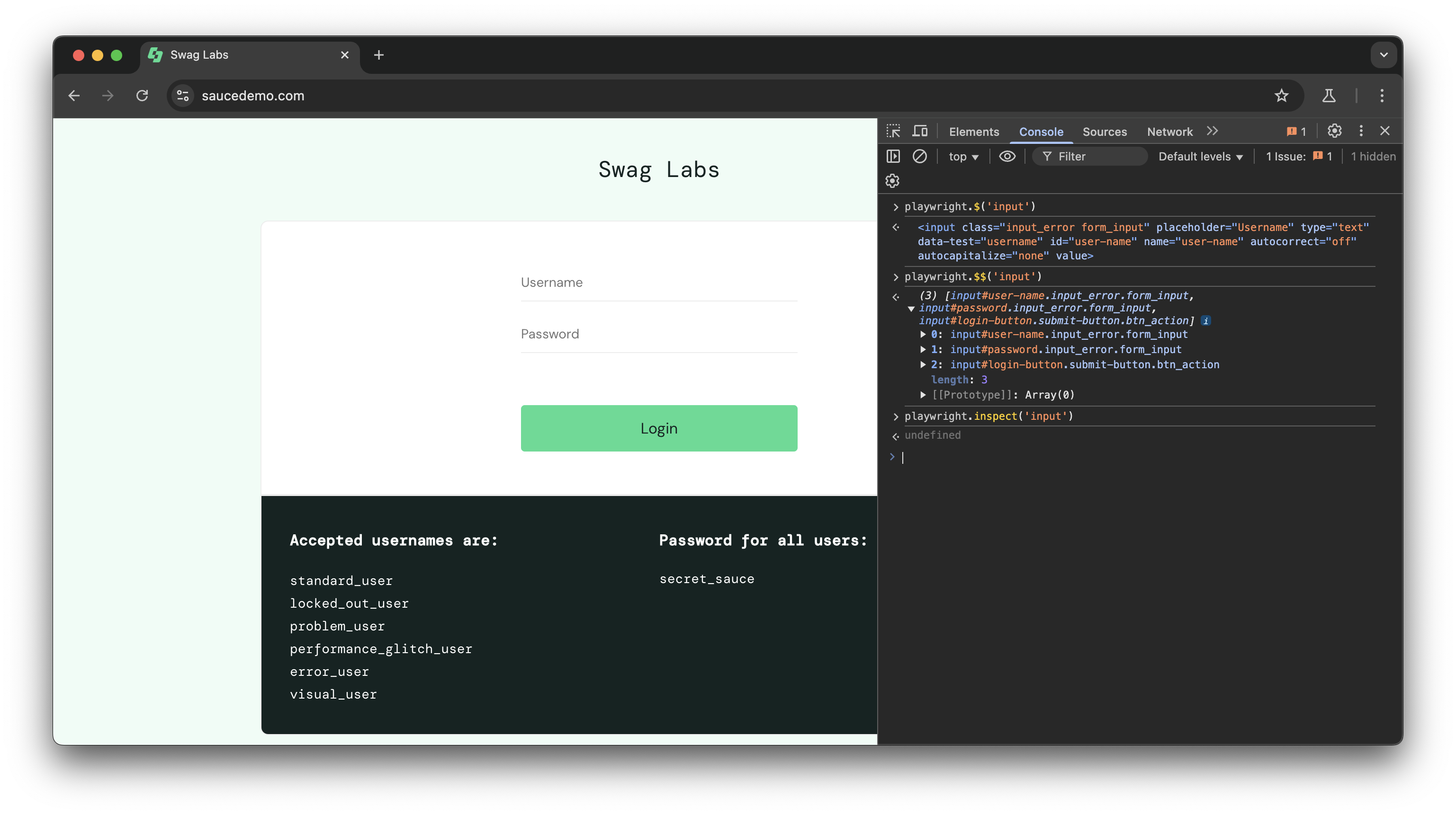Console 에 playwright.inspect('input') 를 기재하고 Enter Key 를 누르면 첫번째 Input 의 Element 로 이동한다