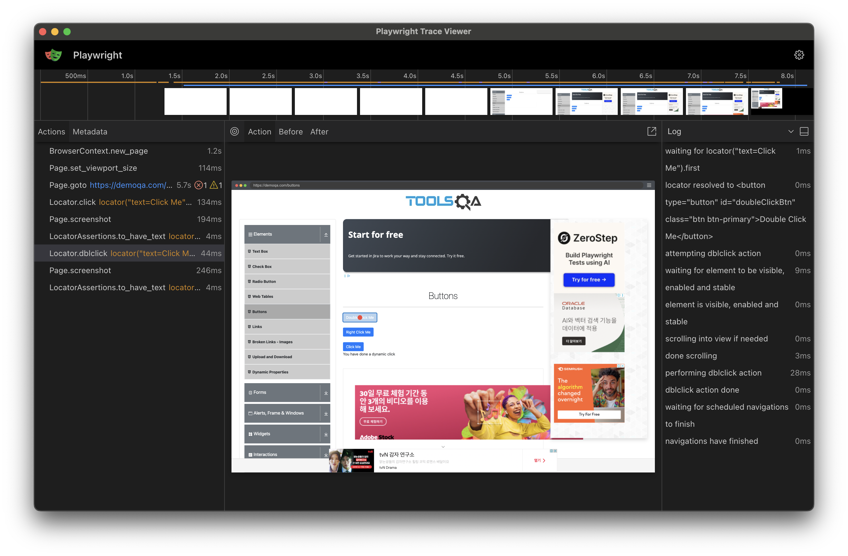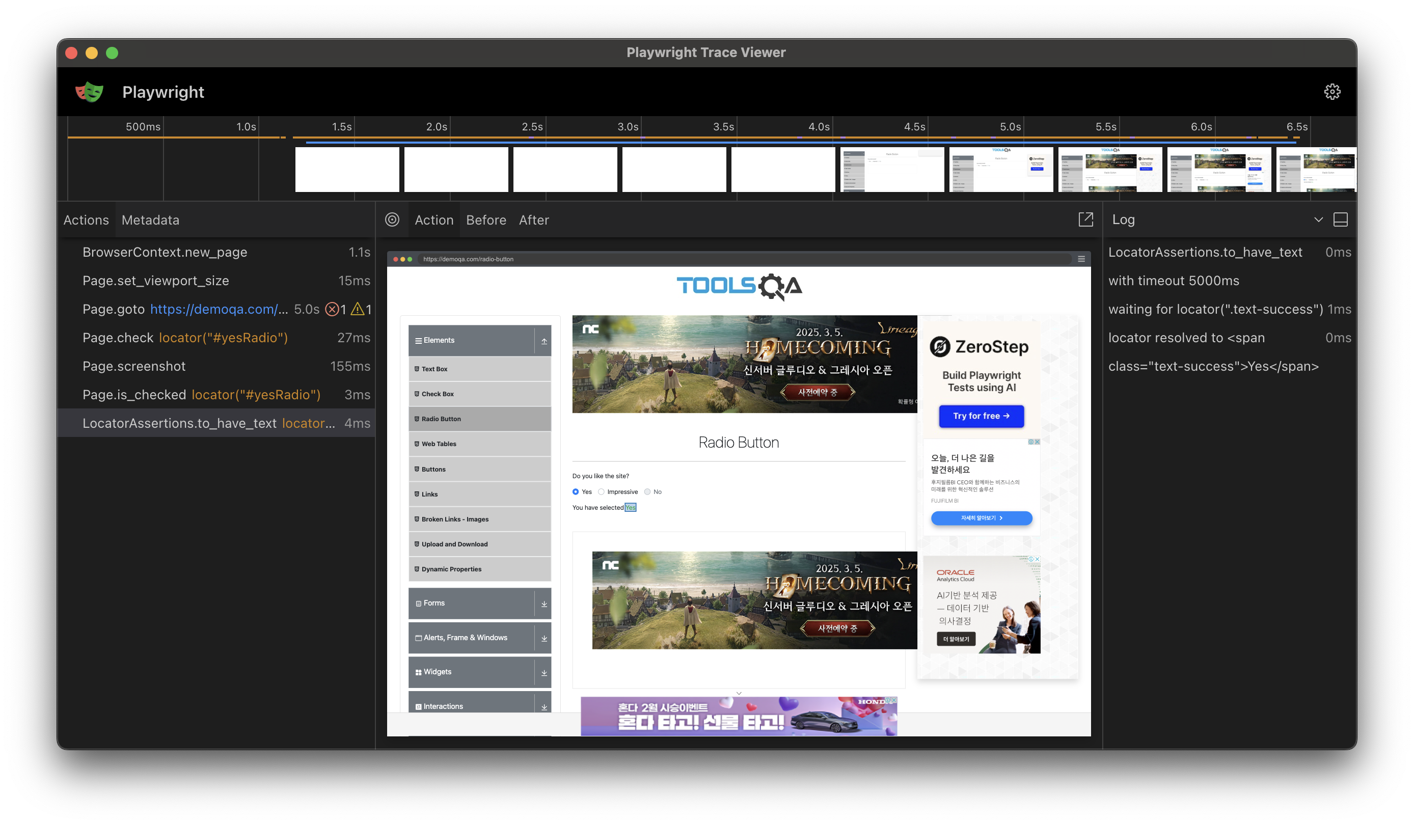 python 으로 코드를 실행하고 playwright show-trace logs/trace.zip 로 결과와 Snapshot 을 확인할 수 있다