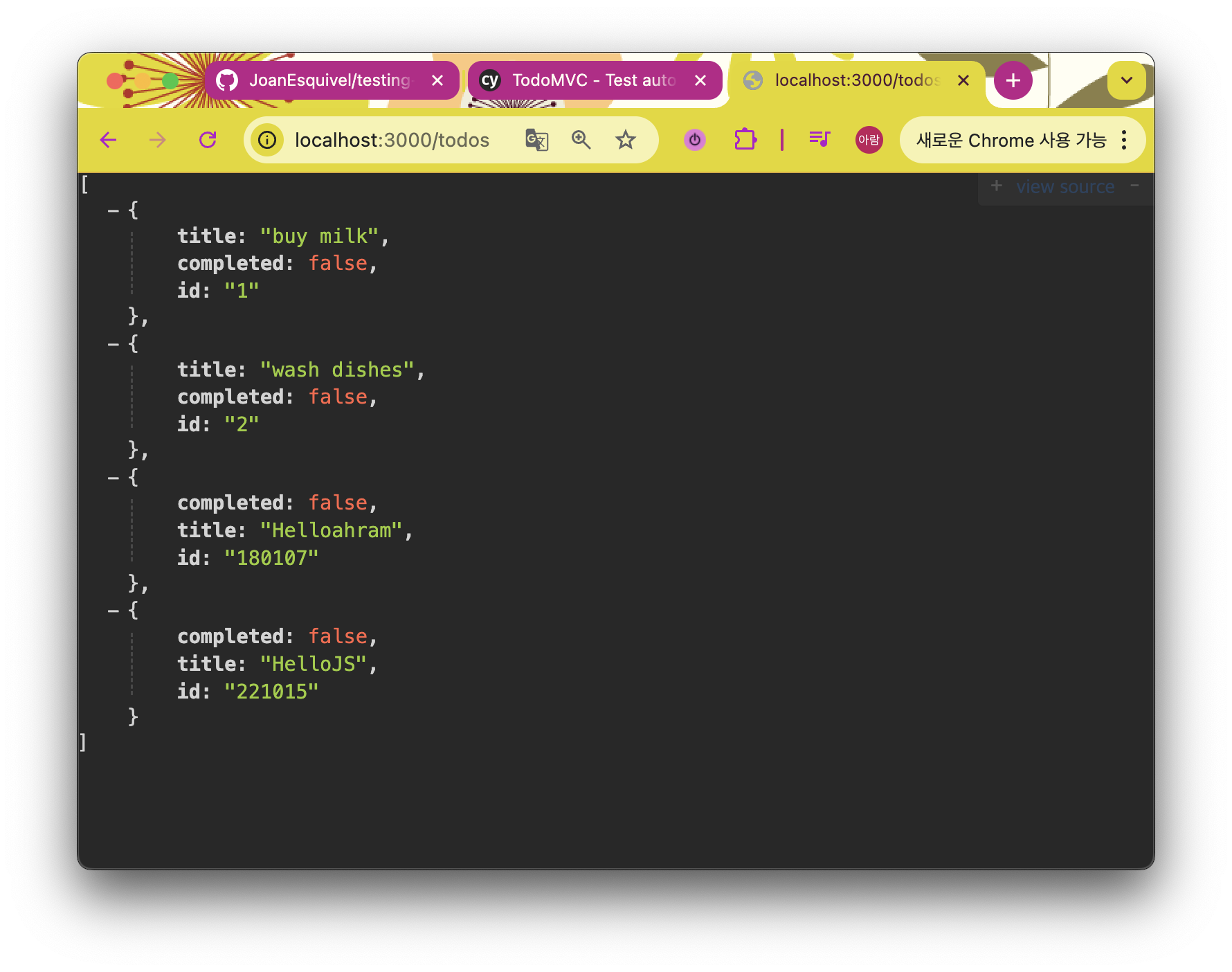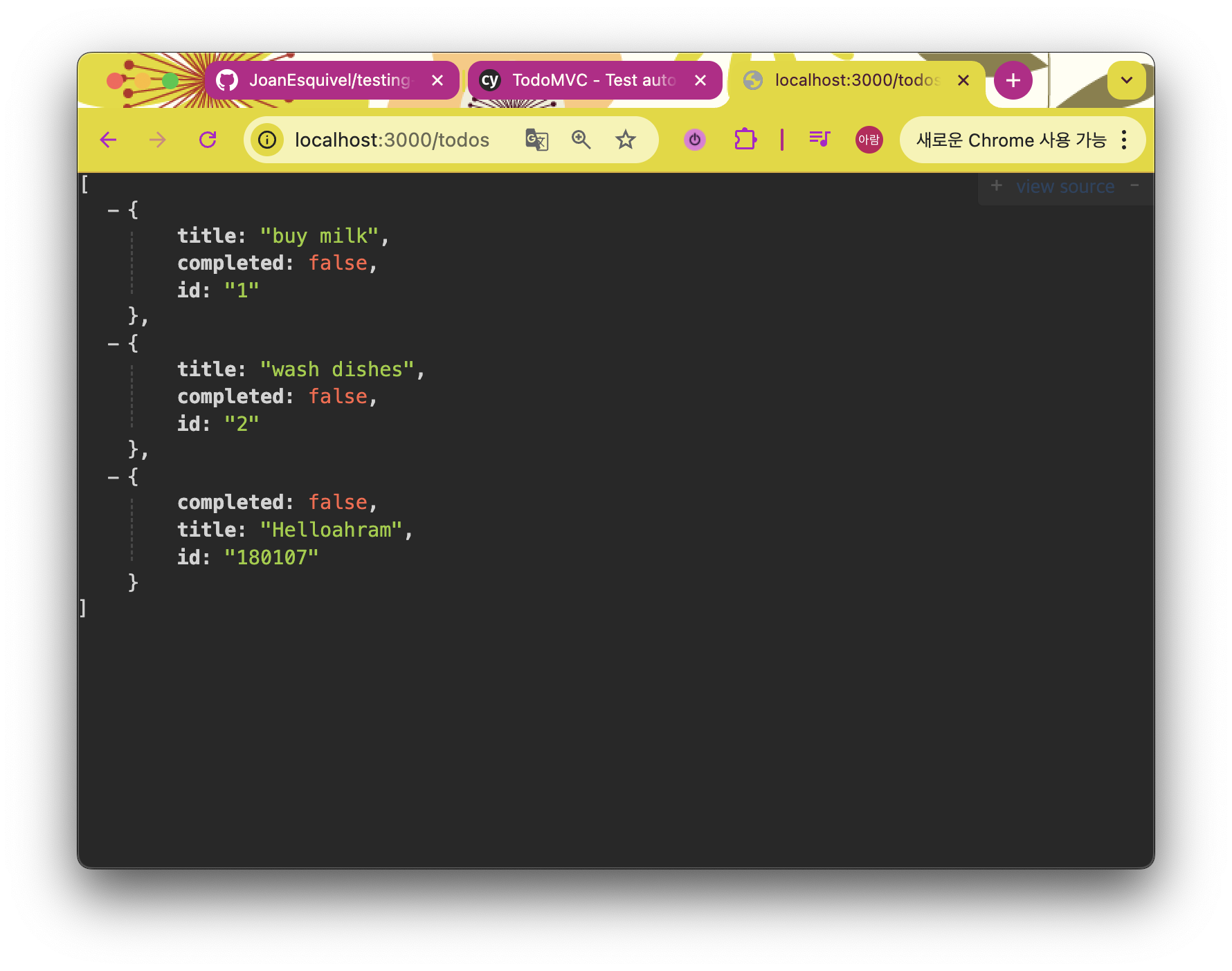 테스트 후에 응답 데이터를 todos_response 변수에 저장하고, print 를 통해 요청과 응답을 출력한다