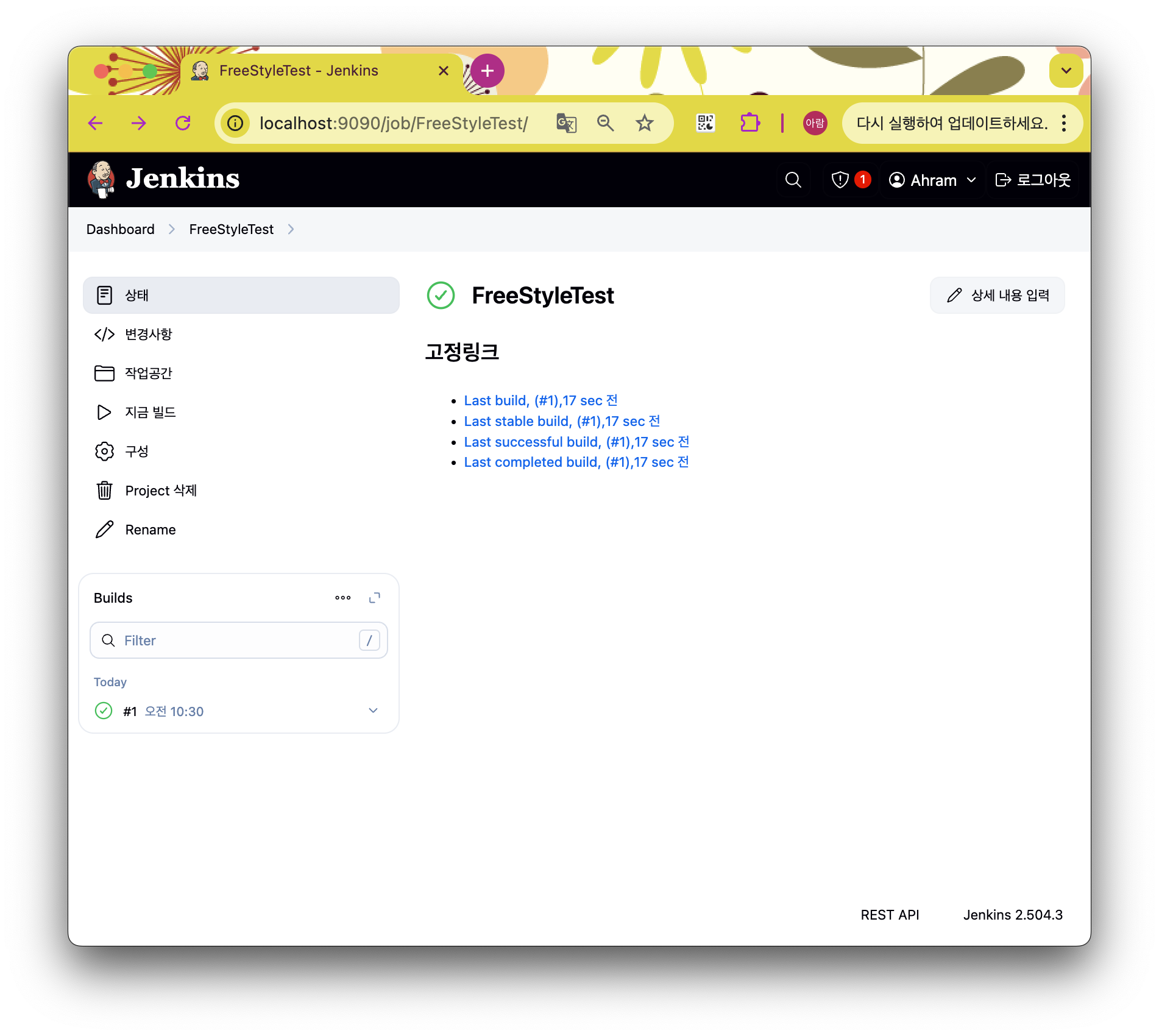 Jenkins 메인 화면에서 왼쪽 영역의 [지금 빌드] 버튼을 누르면 방금 설정한 Freestyle Job 이 빌드된다