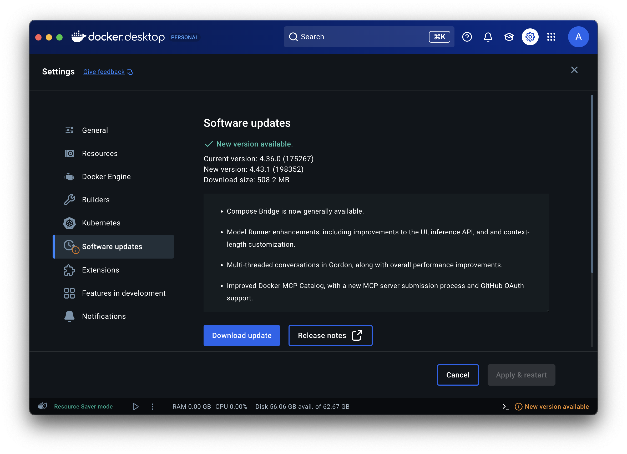 Docker Desktop 에서 설정 -> Software Updates 에서 Download Update 해주면 된다