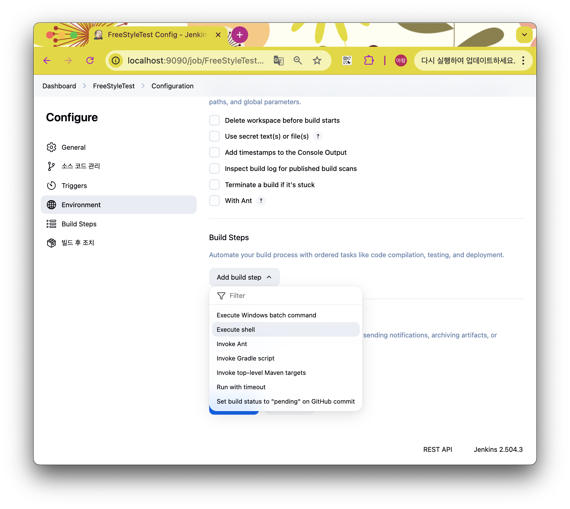 Configure 에서 스크롤을 쭉~~ 내려서 Environment > Build Steps 영역으로 이동하고