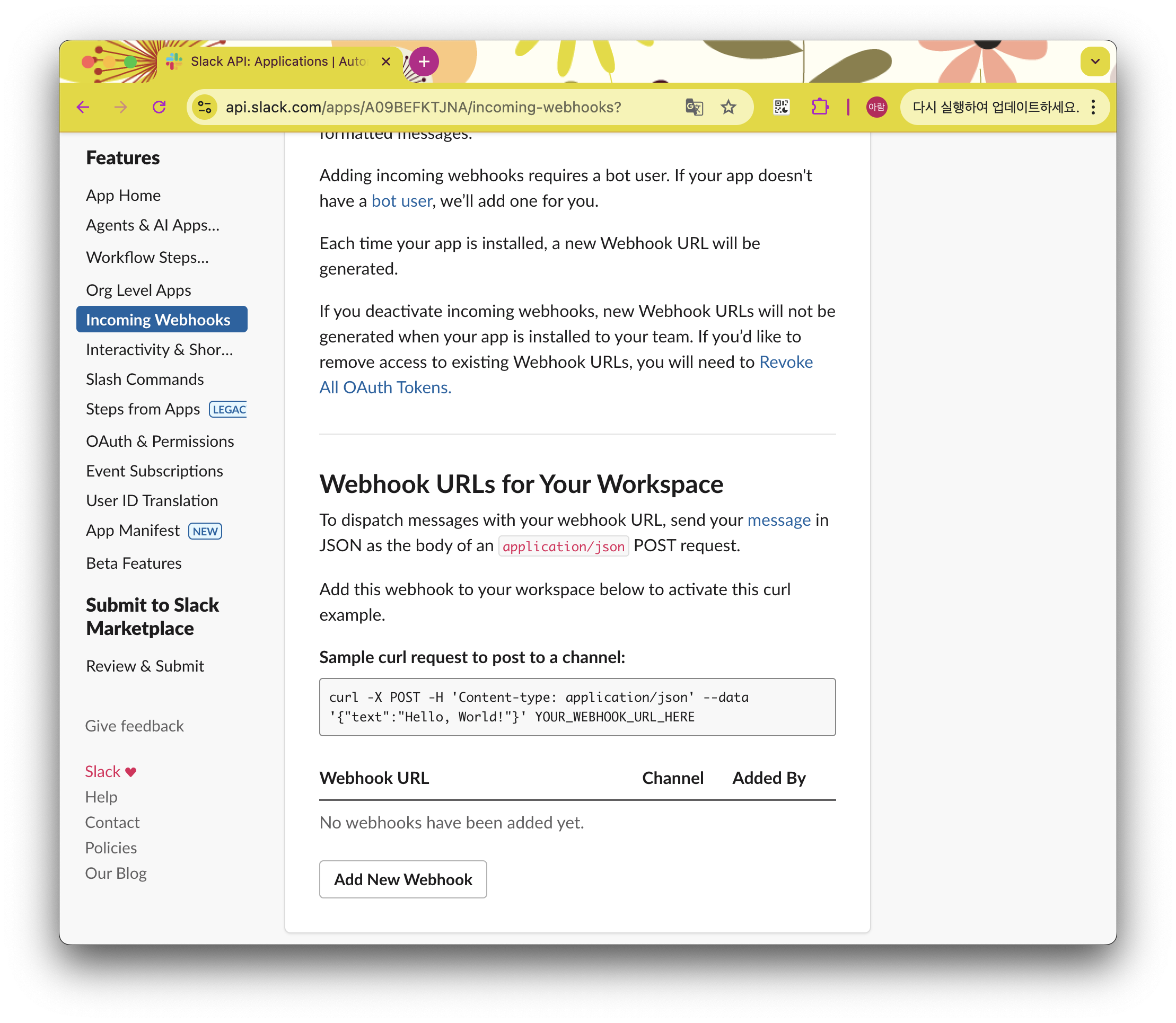 처음에 설정할 때처럼 Webhook URLs for Your Workspace 화면 하단으로 내려간다