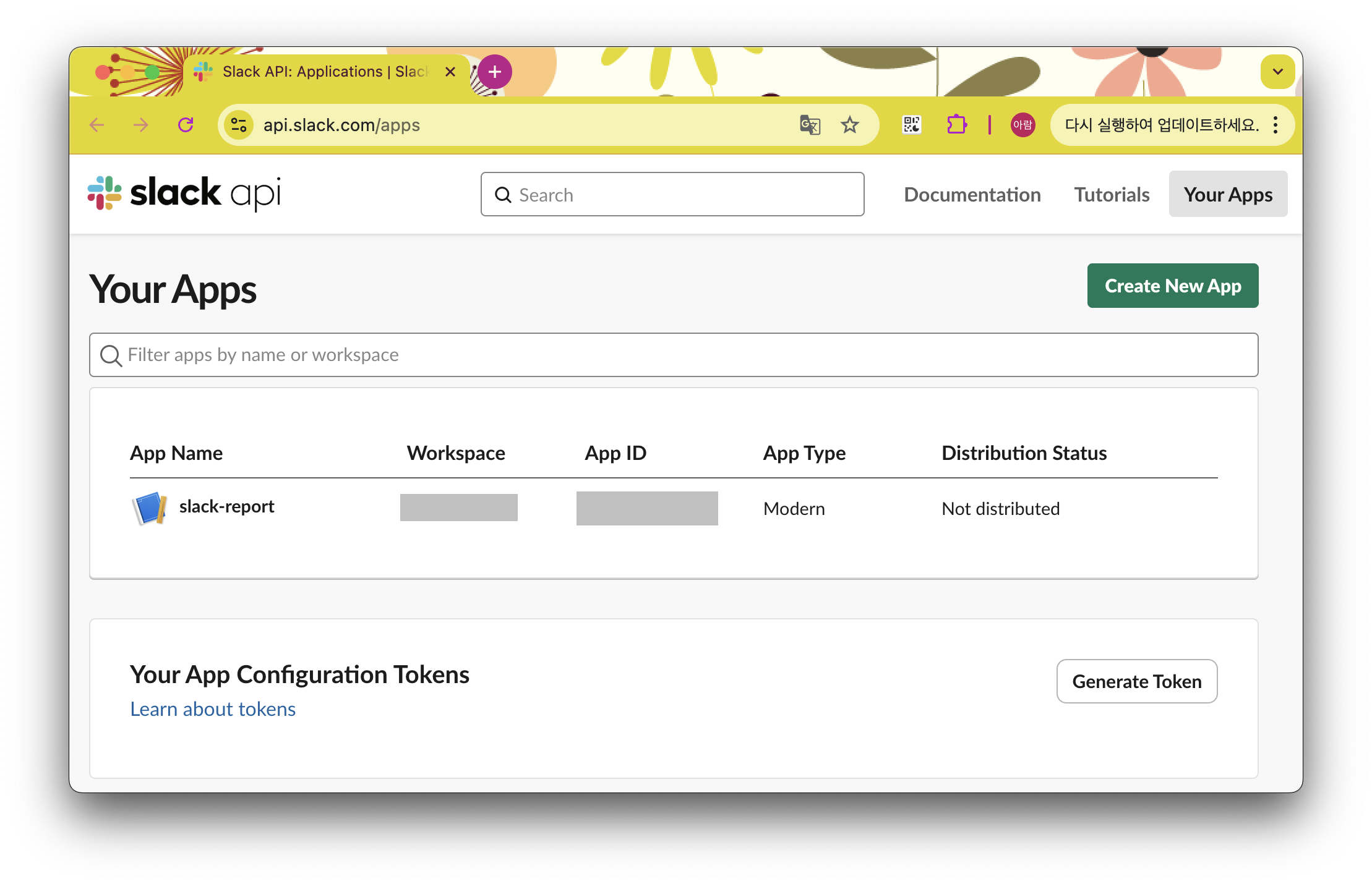 1. Slack 채널 생성 먼저, Slack 에 채널을 하나 만들어준다 2. Slack API 페이지 접속 및 앱 생성 Slack API 페이지에 접속해서 채널에 연동할 앱을 만들어준다 👉 https://api.slack.com/apps Slack API: Applications |