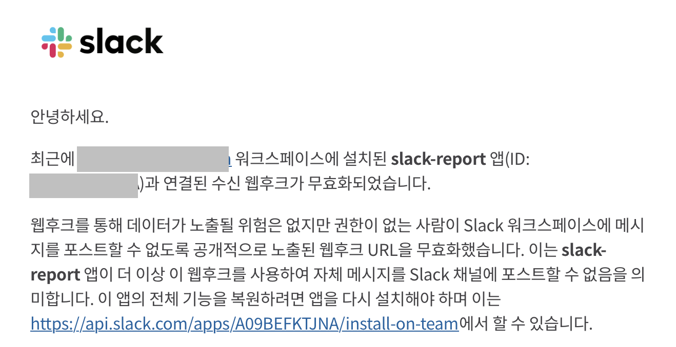 그런 Slack Webhook 을 Git 같은 공용 저장소에 올리게 되면 웹후크가 무효화됐다는 메일이 바로 날아온다