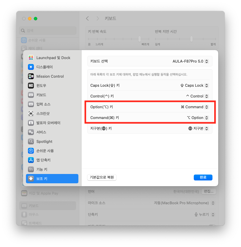 맥북에 독거미 키보드를 쓰니까 Command 키가 바뀌어서 쓰기가 불편하다