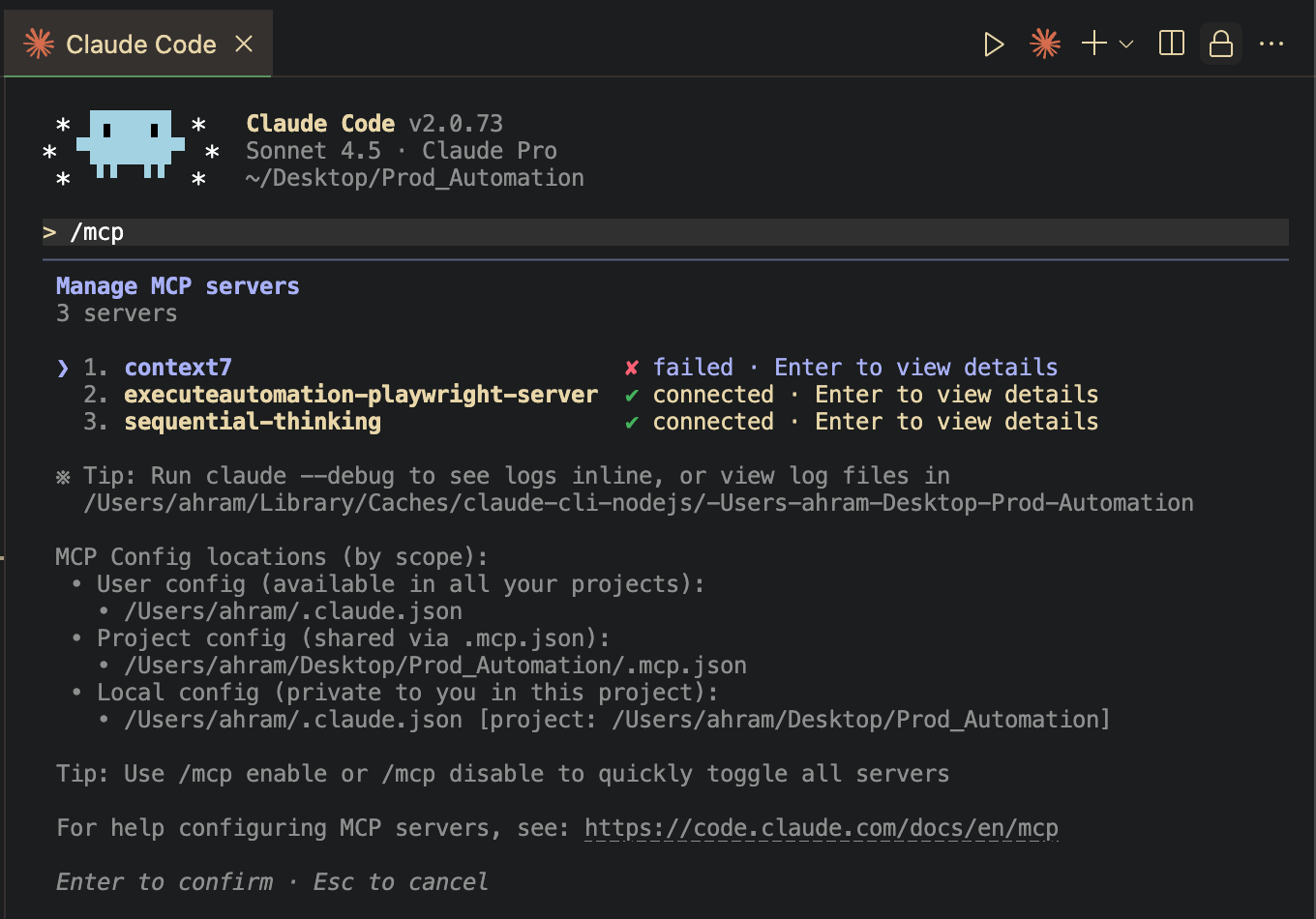 내가 설치한 MCP List 는 Terminal 에서 아래 명령어로 확인하거나, Claude 에서 /mcp 로 확인 가능하다