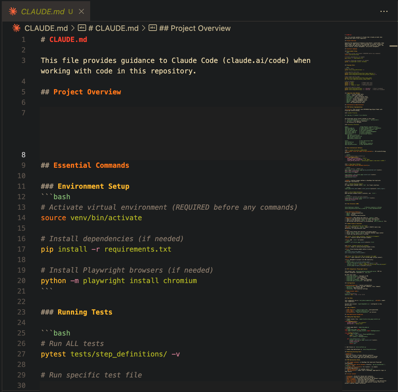 CLAUDE.md 파일에는 Project Overview, Essential Commands, Running Tests 등이 포함된다