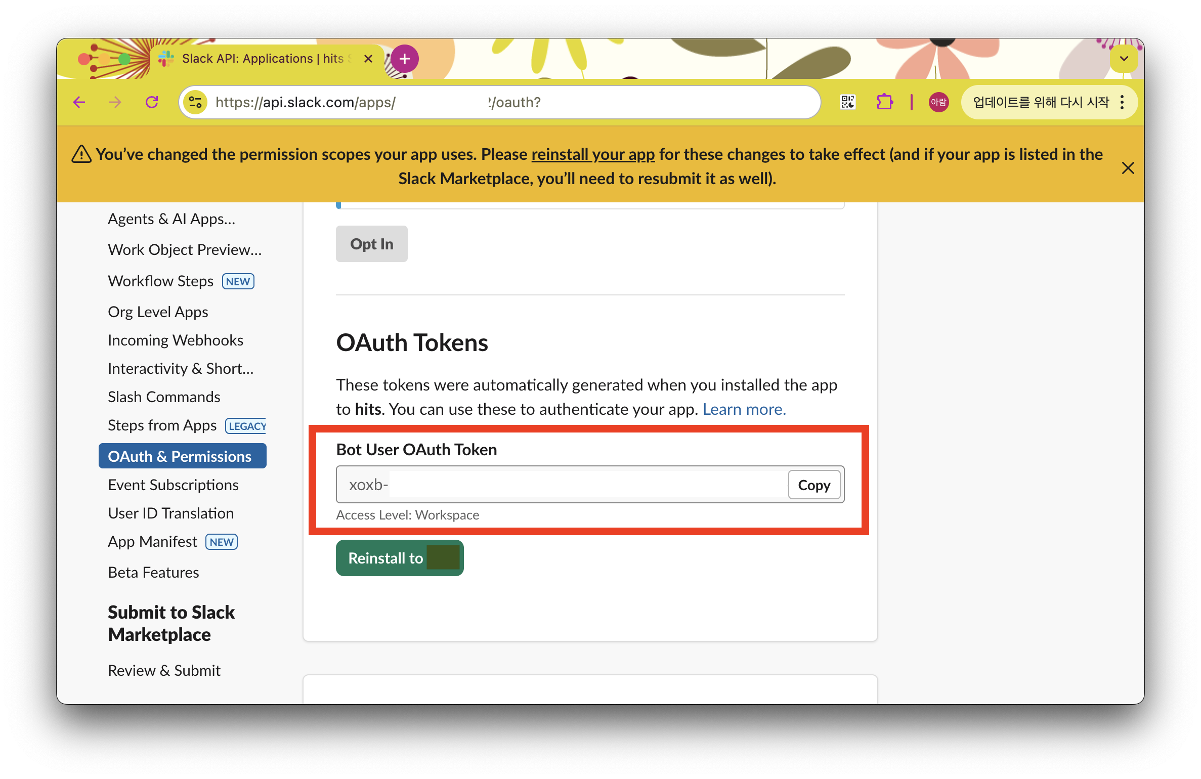 1. "OAuth & Permissions" 에서 "Reinstall to XX" 버튼 선택