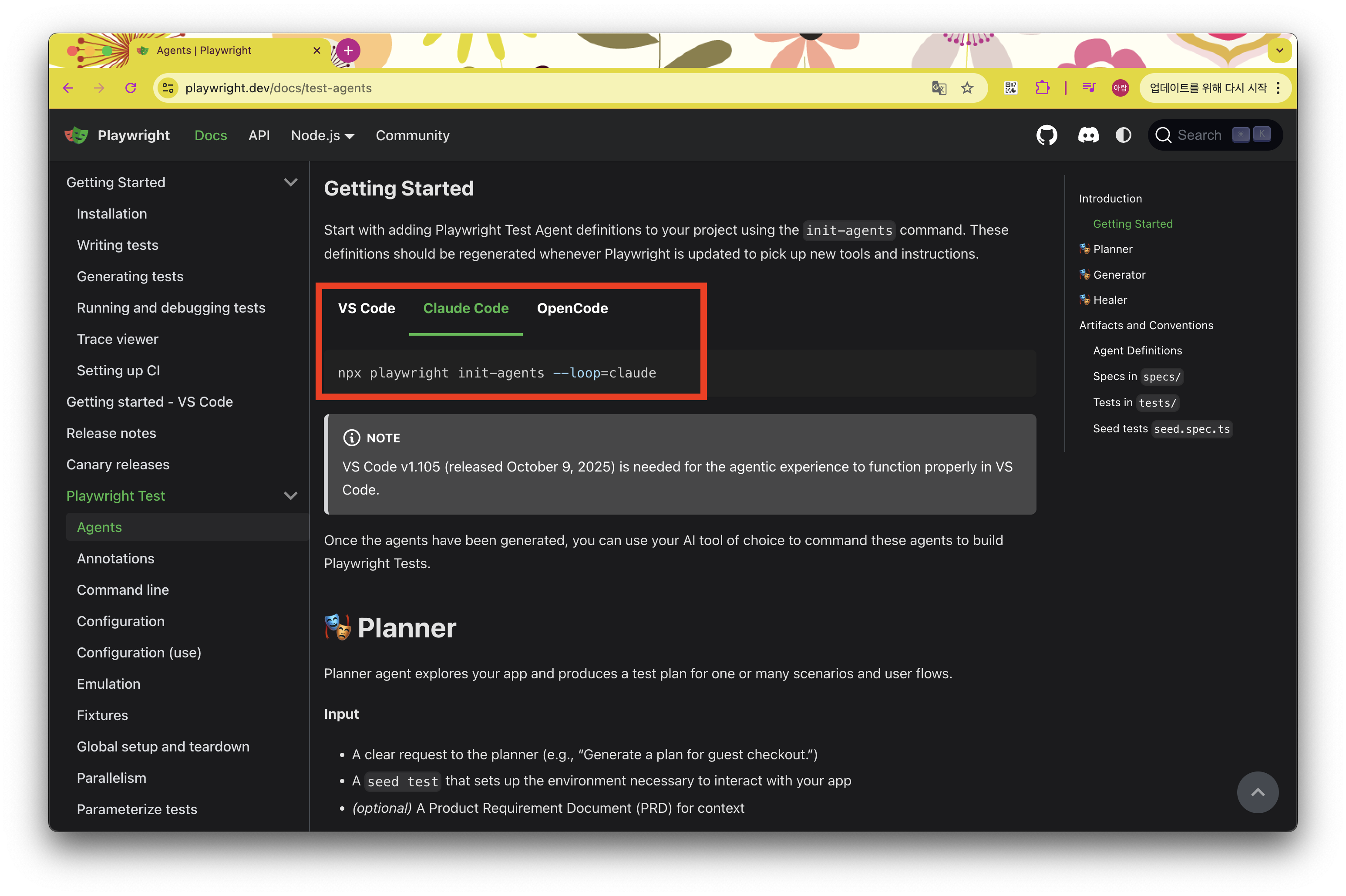 Playwright 에서 제공하는 공식 Test Agents (Planner/ Generator/ Healer) 를 사용하려고 한다