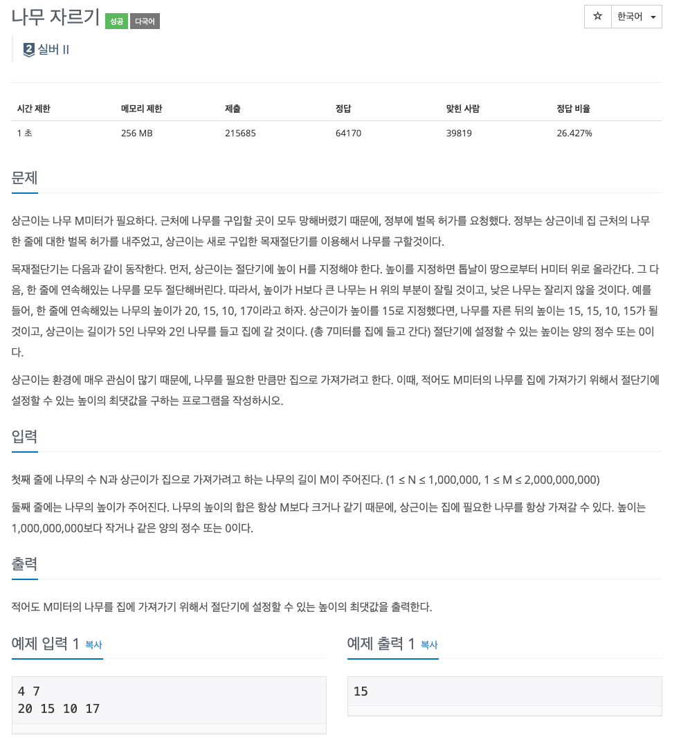 나무의 수 n, 필요한 길이 m, 나무들의 높이 배열이 주어졌을 때,