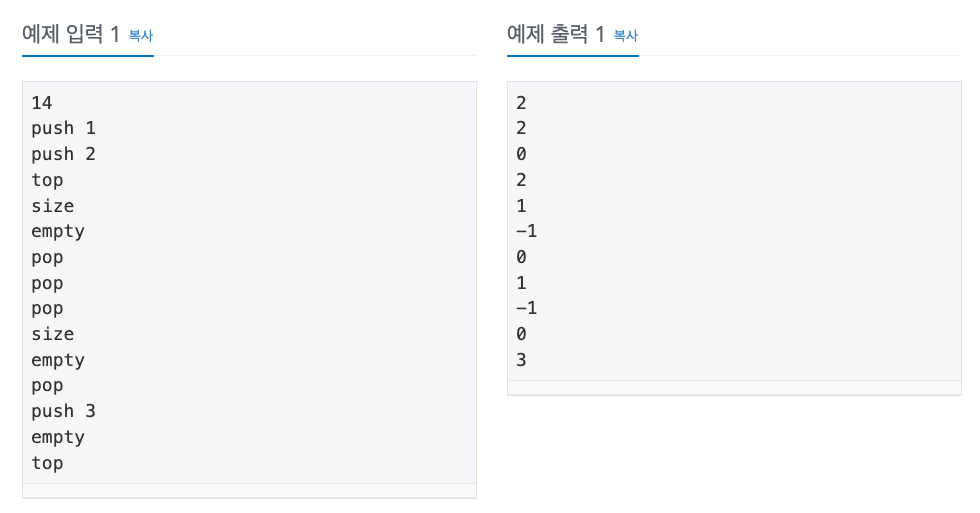 정수를 저장하는 스택을 구현하고, 입력으로 주어지는 명령을 처리하는 프로그램을 작성하시오