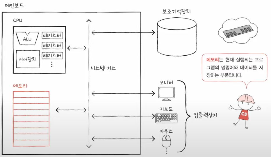 - 메모리는 실행되는 프로그램의 명령어와 데이터를 저장한다